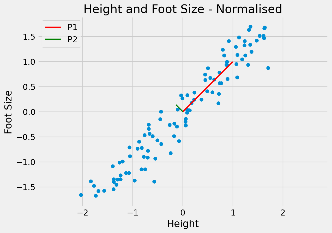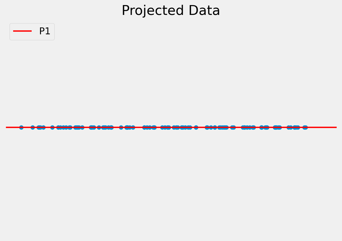 The original data can be approximated as some distance along P1 from the centre of the data cloud.